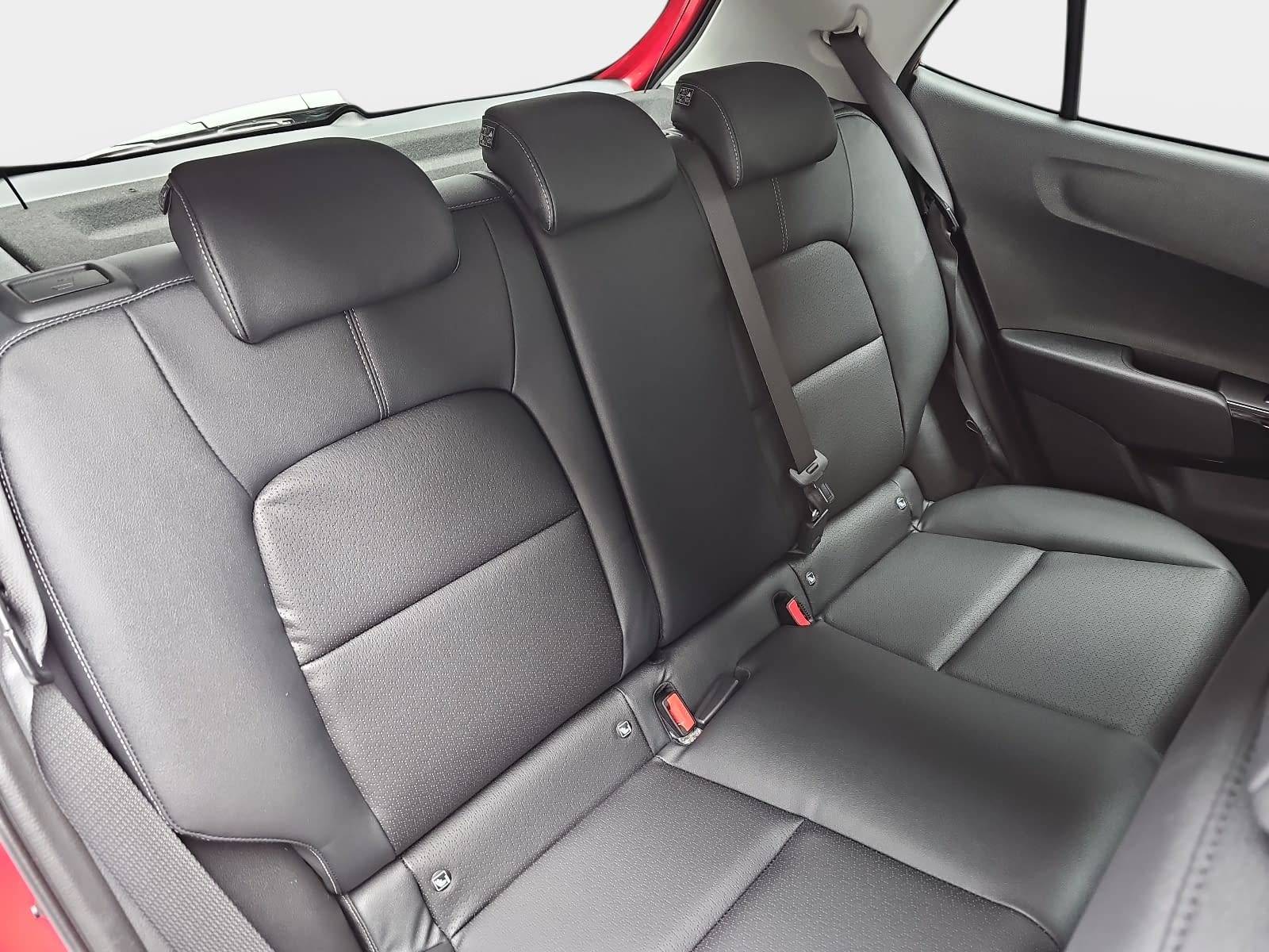 - Sitzbezüge in hochwertiger Ledernachbildung in Schwarz mit Seitenwangen und Nähten in Grau; Interieurelemente in Hochglanzschwarz