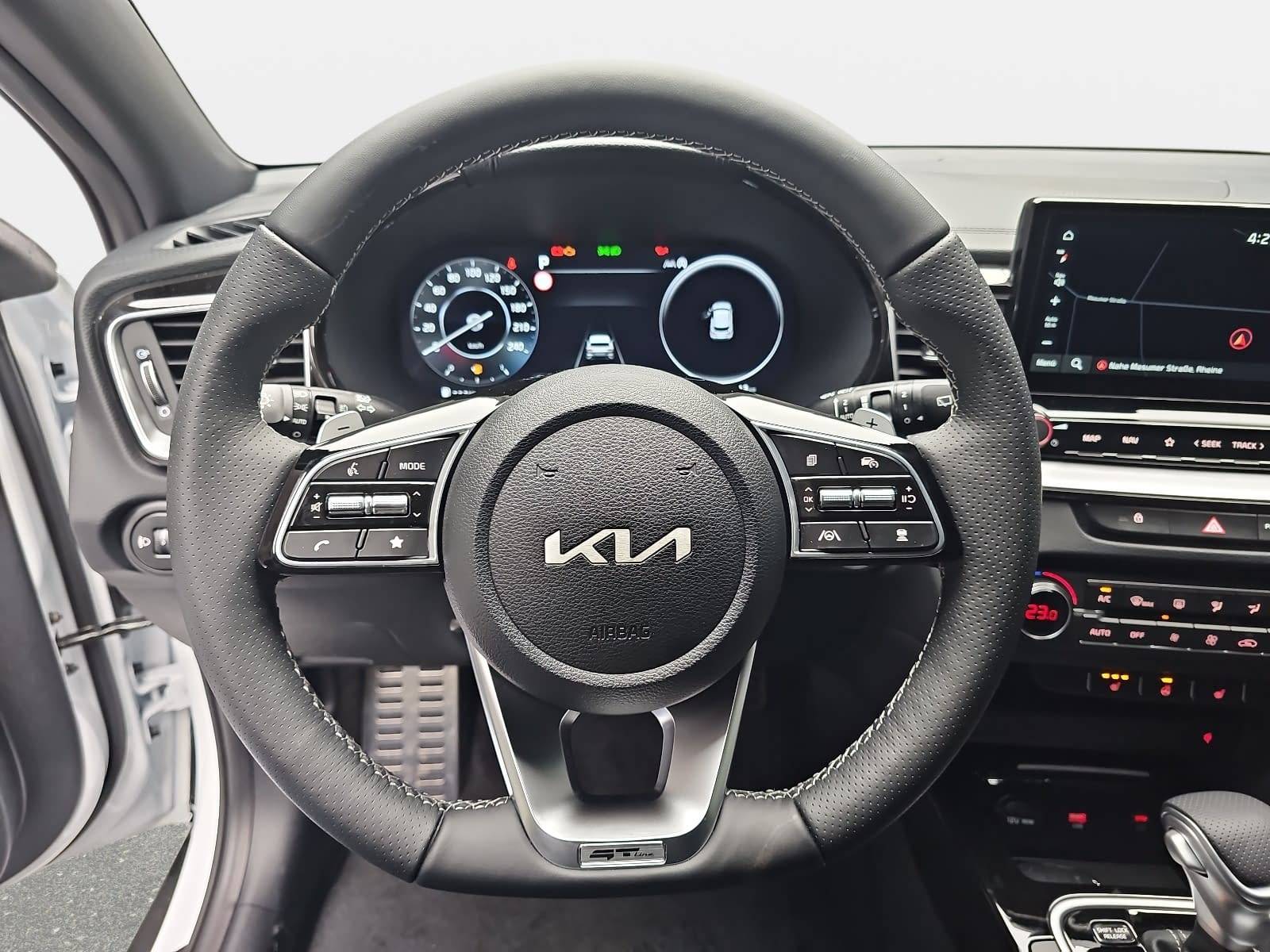AusstattungSicherheitABS Airbag Alarmanlage Isofix Rückfahrkamera Seitenairbags Servolenkung Tagfahrlicht LED-Scheinwerfer Spurhalte Assistent Müdigkeitswarner Totwinkelwarner Abstandstempomat KomfortElektr. Fensterheber elektr. Stabilitätsprogramm (ESP) Klimaautomatik Lichtsensor Multifunktionslenkrad Navigationssystem Nebelscheinwerfer Panoramadach Regensensor Sitzheizung Start/Stopp Automatik Tempomat ExtrasLeichtmetallfelgen Schiebedach Sportpaket Sportsitze UnterhaltungBluetooth MP3-Schnittstelle Radio Beschreibung- 7 Jahre Herstellergarantie ab Meldung bei KIA - EcoDynamics (Start-Stopp-System – ISG) - Automatikgetriebe (7 Stufen) - Sitzheizung hinten (äußere Sitze) - Digitales Cockpit mit 12,3-Zoll-HD-Display - Sitzheizung vorn - Sportsitze mit Sitzbezügen in Leder-Veloursleder-Kombination: Schwarz mit grauer Ziernaht - Privacy-Verglasung (dunkel getönte Scheiben ab B-Säule) - Ottopartikelfilter (OPF) - Klimaautomatik, 2-Zonen, mit Antibeschlagsensor - Fernlichtassistent - Parksensoren hinten - Parksensoren vorn - Regensensor - Rückfahrkamera - Smart-Key und Startknopf - Geschwindigkeitsbegrenzer - Frontscheinwerfer (LED) - LED-Tagfahrlicht vorn - LED-Tagfahrlicht hinten - Geschwindigkeitsregelanlage, adaptiv und navigationsbasiert, inkl. Stopp&Go-Funktion (SCC mit S&G) - Spurfolgeassistent (Lane Follow Assit, LFA) - Smartphone-Schnittstelle Android-Auto und Apple CarPlay mit Sprachsteuerung - JBL Premium-Soundsystem mit Subwoofer und Zentrallautsprecher im Armaturenträger - Glasdach mit elektrischem Glasschiebedach (ausstellbar) - Online-Dienste Kia Connect mit Kia Live (u.a. Verkehrsinformationen in Echtzeit, Wettervorhersage, lokale Suche, Parkmöglichkeiten) sowie Möglichkeit zum Abruf von Fahrzeuginformationen und Steuern von Fahrzeugfunktionen über die Kia Connect App - Kia Kartennavigation mit 26 cm (10,25 Zoll) Bildschirmdiagonale inkl. 2 "Over-the-Air"-Updates und 7-Jahre-Navigationskarten-Update - 2 Frontairbags - 2 Seitenairbags - 2 Vorhangairbags - Aktives Bremslicht (Emergency Stop Signal, ESS) - Antiblockiersystem (ABS) mit elektronischer Bremskraftverteilung - Berganfahrhilfe (Hill-Start Assist Control, HAC) - Bremsassistent (BAS) - Elektronisches Stabilitätsprogramm (ESC) mit Traktionskontrolle (TCS) - aktiver Spurhalteassistent mit korrigierendem Lenkeingriff (Lane Keep Assist, LKA) - Frontkollisionswarner (Forward Collision Avoidance Assist, FCA) mit Bremseingriff und Fußgängererkennung - Diebstahlwarnanlage - Reifendruckkontrollsystem mit Druckanzeige für jedes Rad im Display des Bordcomputers - Aktiver Totwinkelassistent mit Lenk- und Bremseingriff (BCA) - Autobahnassistent (HDA) - Intelligenter Geschwindigkeitsassistent (ISLA) - Insassenalarm (Rear Seat Alert, RSA) - Doppelkupplungsgetriebe - Querverkehrwarner zur Erkennung von Fahrzeugen im toten Winkel beim Querausparken, mit Notbremsfunktion (RCCA) - Frontkollisionswarner, erweitert um Abbiegefunktion (Forward Collision Avoidance Assist, Junction Turning FCA-JT) - Lederlenkrad - Lenkrad beheizbar - Kunstlederschaltknauf - Drive Mode Select - Außenspiegel mit integrierten Blinkleuchten - Außenspiegel elektrisch einstellbar - Außenspiegel beheizbar - Außenspiegel elektrisch anklappbar - Bordcomputer - Dämmerungssensor - Elektrische Fensterheber mit Einklemmschutz vorn - Elektrische Fensterheber mit Einklemmschutz hinten - Parkbremse, elektronisch - Zentralverriegelung mit Funkfernbedienung - Elektrische Heckklappe, sensorgesteuert - Nebelscheinwerfer LED - Müdigkeitswarner (Driver Attention Warning, DAW) - 18-Zoll-Leichtmetallfelgen - Ausstiegsassistent (Safe Exit Warner, SEW) - 2 Frontlautsprecher - 2 Hecklautsprecher - 2 Hochtöner vorn - Multifunktionslenkrad - Bluetooth-Freisprecheinrichtung - Digitaler Radioempfang (DAB+) - USB-Anschluss - Gurtwarnsystem hinten - Fahrersitz höhenverstellbar - Fahrersitz mit elektr. einstellbarer Lendenwirbelstütze - Beifahrersitz höhenverstellbar - Beifahrersitz mit elektr. einstellbarer Lendenwirbelstütze - elektrische Sitzverstellung mit Memory-Funktion (Fahrersitz) - Getränkehalter vorne - Dachhimmel und Säulenverkleidung in Schwarz - Induktive Ladestation für Smartphones - Energie-Regenerationssystem (AMS) - Drittes Bremslicht (LED) im Heckspoiler - 12-Volt-Steckdose in der Zentralkonsole - 12-Volt-Steckdose im Gepäckraum - Einstiegsleisten aus Aluminium - Innenrückspiegel selbstabblendend - Gurtwarnsystem vorn - Kopfstützen an allen Sitzplätzen höhenverstellbar - Reifenreparaturset - Aluminium-Sportpedale - Dachkonsole vorn mit Brillenfach - Gepäcknetzösen im Laderaum - Gepäckraumbeleuchtung - Mittelarmlehne hinten mit integriertem Getränkehalter - Rücksitzbank asymmetrisch geteilt, umklappbar - Mittelarmlehne vorn mit Ablagefach - Dachkonsole vorn mit Lesespots und zentraler Beleuchtung (LED) - Mittelarmlehne vorn verschiebbar - Servolenkung, elektronisch unterstützt - Rückleuchten mit wabenförmigen LED-Modulen - Dreipunkt-Sicherheitsgurte an allen Sitzplätzen - ISOFIX-Halterungen an äußeren Rücksitzen - Sicherheitsgurte vorn höhenverstellbar - Wegfahrsperre - Wärmeschutzverglasung - Außenspiegel in Hochglanzschwarz - Fußmattenset - Sonnenblenden mit Make-up-Spiegeln, beleuchtet
