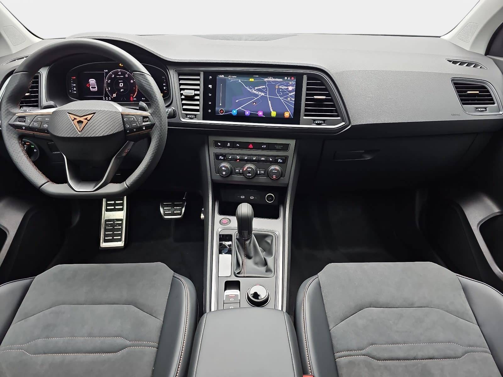 AusstattungSicherheitABS Airbag Einparkhilfe (Sensoren) Isofix Kurvenlicht Rückfahrkamera Seitenairbags Servolenkung Tagfahrlicht LED-Scheinwerfer Spurhalte Assistent Müdigkeitswarner Abstandstempomat Notrufsystem KomfortElektr. Fensterheber elektr. Stabilitätsprogramm (ESP) Elektrische Sitze Klimaautomatik Lichtsensor Multifunktionslenkrad Navigationssystem Nebelscheinwerfer Panoramadach Regensensor Sitzheizung Start/Stopp Automatik Tempomat ExtrasAnhängerkupplung Dachreling Leichtmetallfelgen Schiebedach Sportpaket Sportsitze UnterhaltungBluetooth MP3-Schnittstelle Radio Beschreibung- Garantieverlängerung 3 Jahre/100.000 km - Anhängerkupplung (Kugelkopf mit elektr. Entriegelung, schwenkbar) - Heckklappe/-Deckel elektr. betätigt (öffnen + schliessen, sensorgesteuert) - Telefon: Induktionsladeschale für Smartphone - Räder: LM-Felgen 8x19 (Exclusive I, schwarz matt,) mit Reifen 235/40 R19 - Lackierung: Metallic- o. Perleffekt Lackierung - Räder: Platzsparendes Notrad, Radial-Bauweise (5-Loch) - Rücksitzlehnen umklappbar mit Fernentriegelung im Kofferraum - Schiebe-/Hebedach elektrisch (Glas) - Sitze: Sitz vorn links elektr. verstellbar (mit Memory) - Airbag: Fahrer-/Beifahrerseite - Airbag Beifahrerseite abschaltbar - Ambiente-Beleuchtung LED - Anti-Blockier-System (ABS) - Antriebs-Schlupfregelung (ASR) - Antriebsart: Frontantrieb - Navigationssystem und Audiosystem mit Touchscreen Farbbildschirm - Audiosystem: Radioempfang digital (DAB+) - Audiosystem: Sprachsteuerungs-System - USB-Schnittstelle vorn (2-fach, Typ C) - USB-Ladeanschlüsse (2-fach, Typ C) für 2.Sitzreihe - Außenspiegel elektr. verstell-, heiz- und anklappbar mit Spiegelabsenkung und Welcome Light - Telefon: Bluetooth-Schnittstelle mit Freisprecheinrichtung integriert - Bluetooth Audio-Streaming - Bordcomputer - Dachreling schwarz - Einstiegsleisten (Aluminium) vorn, beleuchtet - Elektron. Stabilitätskontrolle (ESC) - Fahrassistenz-System: Berganfahr-Assistent - Fahrassistenz-System: Fahrprofilauswahl (CUPRA Drive Profile) - Fahrassistenz-System: Müdigkeitserkennung - Paket: Parken - Parklenkassistent mit Einparkhilfe vorn und hinten inkl. Rückfahrkamera - Fahrassistenz-System: Spurhalteassistent - Fahrassistenz-System: Umfeldbeobachtungssystem (Front assist) mit City-Notbremsfunktion - Fahrassistenz-System: Verkehrszeichenerkennung - Fensterheber elektrisch vorn + hinten mit Komfortschaltung - Audiosystem: Full Link (MirrorLink, Apple CarPlay und Android Auto) - Fußraumbeleuchtung LED - Laderaum: Gepäckraumabdeckung - Gepäckraumbeleuchtung (LED) - Verzurrösen Koffer-/Laderaum - Automatische Distanzregelung (mit follow to stop) und Speed-Limiter - Getriebe: 7-Gang - Doppelkupplungsgetriebe DSG - Handschuhfach mit LED-Beleuchtung - LED Heckleuchten mit dynamischem Blinklicht - Heckspoiler Wagenfarbe (Dachspoiler) - Isofix-Aufnahmen für Kindersitz an Rücksitz - Klimaanlage Climatronic 2-Zonen - Airbag: Knieairbag Fahrerseite - Kombiinstrument digital (10,25 Zoll) - Airbag: Kopf-Airbag-System - Lenkung: Lenkrad heizbar (Sport/Leder) mit Multifunktion und Schaltfunktion - Paket: Sicht - Licht- und Regensensor - Innenspiegel mit Abblendautomatik - Lichtassistent (Coming Home, Leaving Home) - Mittelkonsole vorn mit Mittelarmlehne, Becherhalter, Ablagebox und Luftausströmer hinten - Mittelarmlehne hinten - Mobile Online Dienste Cupra Connect plus - LED Nebelscheinwerfer mit Abbiegelicht - Notrufsystem - Otto-Partikelfilter (OPF) - Parkbremse elektrisch mit Auto-Hold-Funktion - Pedale Aluminium-Design - Radlaufabdeckung vorn und hinten lackiert - Räder: Reifenkontroll-Anzeige - Rücksitzlehne geteilt/klappbar (1/3-2/3) - Schadstoffarm nach Abgasnorm Euro 6e - LED Voll Scheinwerfer mit Leuchtweitenregelung automatisch - Zentralverriegelung: Schließ-/Startsystem Kessy - Airbag: Seitenairbag - Verglasung: Seitenscheiben hinten und Heckscheibe abgedunkelt - Servolenkung elektro-mechanisch - Sitzbezug / Polsterung: Sitzmittelbahn in Mikrofaser - Sonnenblenden mit Spiegel (beleuchtet) - Sitze: Sport-Schalensitze vorn mit integrierten Kopfstützen höhenverstellbar mit Lendenwirbelstützen - Start/Stop-Anlage - Steckdose (12V-Anschluß) vorn - Stoßfänger hinten Cupra-Design mit Diffusor - Stoßfänger vorn Cupra-Design - LED Tagfahrlicht - Wegfahrsperre (elektronisch) - Wärmeschutzverglasung