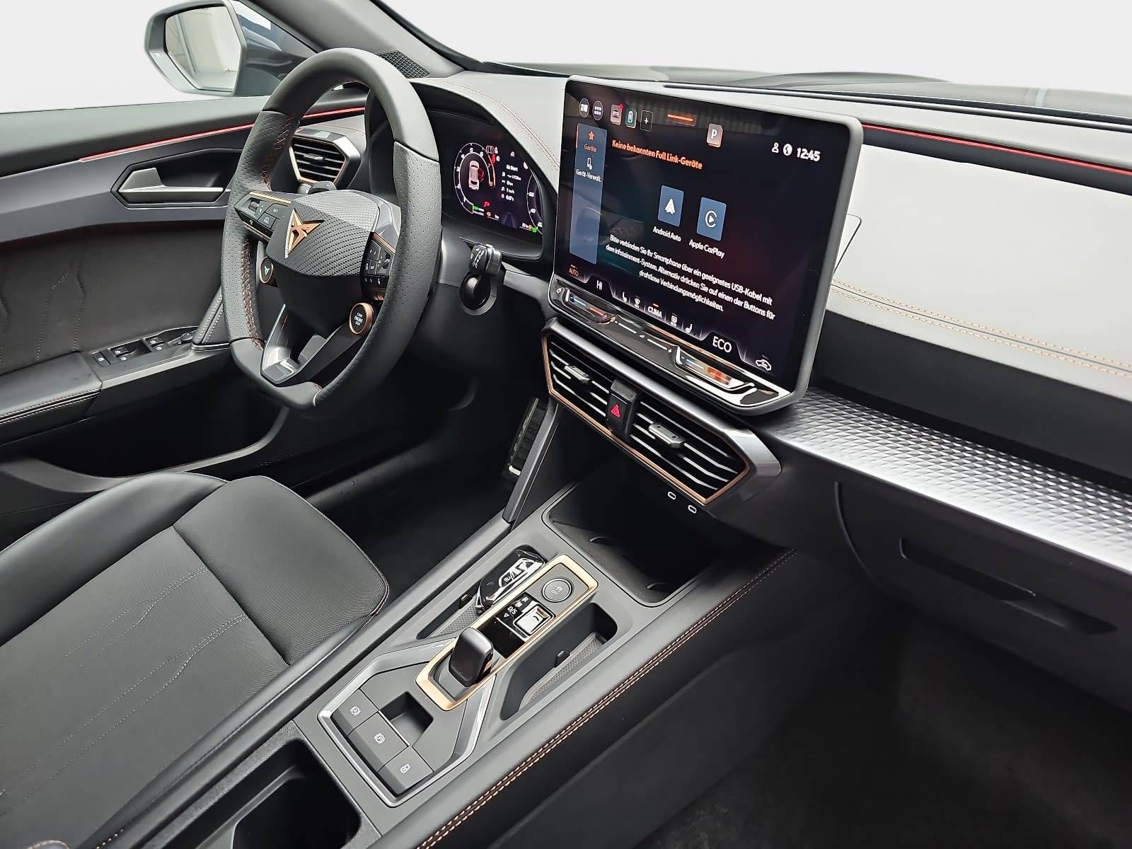 AusstattungSicherheitABS Airbag Alarmanlage Isofix Kurvenlicht Rückfahrkamera Seitenairbags Servolenkung Tagfahrlicht LED-Scheinwerfer Spurhalte Assistent Müdigkeitswarner Abstandstempomat Notrufsystem KomfortElektr. Fensterheber elektr. Stabilitätsprogramm (ESP) Klimaautomatik Lichtsensor Multifunktionslenkrad Navigationssystem Nebelscheinwerfer Panoramadach Regensensor Sitzheizung Tempomat ExtrasAnhängerkupplung Dachreling Leichtmetallfelgen Schiebedach Sportpaket Sportsitze UnterhaltungBluetooth MP3-Schnittstelle Radio Beschreibung- Anhängerkupplung (Kugelkopf mit elektr. Entriegelung, schwenkbar) - Komforttelefonie: Wireless Charging (fast charge) ohne Außenantennenanbindung - Garantieverlängerung 3 Jahre/150.000 km - Lackierung: Metallic o. Perleffekt Lackierung - Paket: Performance - HD Matrix-LED-Scheinwerfer - Adaptive Fahrwerksregelung (DCC) - Paket: Skyline - Panorama Schiebe-/Hebedach elektrisch - Paket: Winter - Sitzheizung vorn - Lenkrad heizbar - Airbag: Fahrer-/Beifahrerseite - Airbag Beifahrerseite abschaltbar - Antriebsart: Frontantrieb - Außenspiegel elektr. verstell-, heiz- und anklappbar - lackiert - integrierter LED Blinker - Connectivity-Box - Dachhimmel schwarz - Paket: Black - Dachreling schwarz, hochglänzend - Paket: Parken - Einparkhilfe vorn und hinten - Rückfahrkamera - Automatische Distanzregelung (ACC) mit Geschwindigkeits-Begrenzer - Fahrassistenz-System: Fahrprofilauswahl (CUPRA Drive Profile) - Fahrassistenz-System: Fernlichtassistent - Fahrassistenz-System: Müdigkeitserkennung - Fahrassistenz-System: Spurhalteassistent - Fahrassistenz-System: Umfeldbeobachtungssystem (Front assist) mit City-Notbremsfunktion - Fahrassistenz-System: Verkehrszeichenerkennung - Fensterheber elektrisch vorn + hinten mit Komfortschaltung - Audiosystem: Full Link (MirrorLink, Apple CarPlay und Android Auto) - Laderaum: Gepäckraum Bodenmatte - Gepäckraumabdeckung - Gepäckraumbeleuchtung (LED) - Gepäckraumklappe mit elektrischer Bedienung - Getriebe: 6-Gang - Doppelkupplungsgetriebe DSG - Handschuhfach mit LED-Beleuchtung - Hybrid 150 kW Systemleistung (Motor 1,5 Ltr. - 110 kW TSI eHybrid) - Innenausstattung: Interieurleisten Copper - Isofix-Aufnahmen für Kindersitz an Beifahrersitz und Rücksitz (inkl. i-Size-Kindersitze) - Klimaanlage Climatronic 3-Zonen - Kombiinstrument digital (virtual cockpit) - Airbag: Kopf-Airbag-System - Kopfstützen vorne integriert - Kopfstützen hinten (3-fach) - Ladekabel mit Schukostecker - Lenkung: Lenkrad (CUPRA Supersport, Leder) mit Multifunktion und Schaltfunktion - Paket: Sicht - Licht-/Regensensor - Innenspiegel mit Abblendautomatik - Lichtassistent (Coming Home, Leaving Home) - Räder: LM-Felgen - Media-System Plus mit Touchscreen Farbbildschirm - Audiosystem: Sprachsteuerungs-System - Audiosystem: Vorbereitung für spätere Freischaltung Navigationsfunktion Cupra Connect Plus - Mittelarmlehne vorn - Mobile Online Dienste Cupra Connect plus (Andriod/Carplay) - Notrufsystem - Otto-Partikelfilter (OPF) - Parkbremse elektrisch mit Auto-Hold-Funktion - Audiosystem: Radioempfang digital (DAB+) - Räder: Reifen-Reparaturset - Räder: Reifenkontroll-Anzeige - Rücksitzlehne geteilt/klappbar mit Mittelarmlehne und Durchladeeinrichtung - Schadstoffarm nach Abgasnorm Euro 6e - Airbag: Seitenairbag - Airbag: Seitenairbag vorn mitte (Central Airbag) - Verglasung: Seitenscheiben ab 2.Sitzreihe und Heckscheibe dunkel getönt (Privacy Glass) - Sitzbezug / Polsterung: Stoff/Kunstleder schwarz (Sharp Textil) - Sitze: Sportsitze vorne höhenverstellbar mit Lendenwirbelstützen - Steckdose 230V im Gepäckraum - USB-Schnittstelle - Zentralverriegelung / Startanlage Keyless Go (Start-Stop-Knopf)