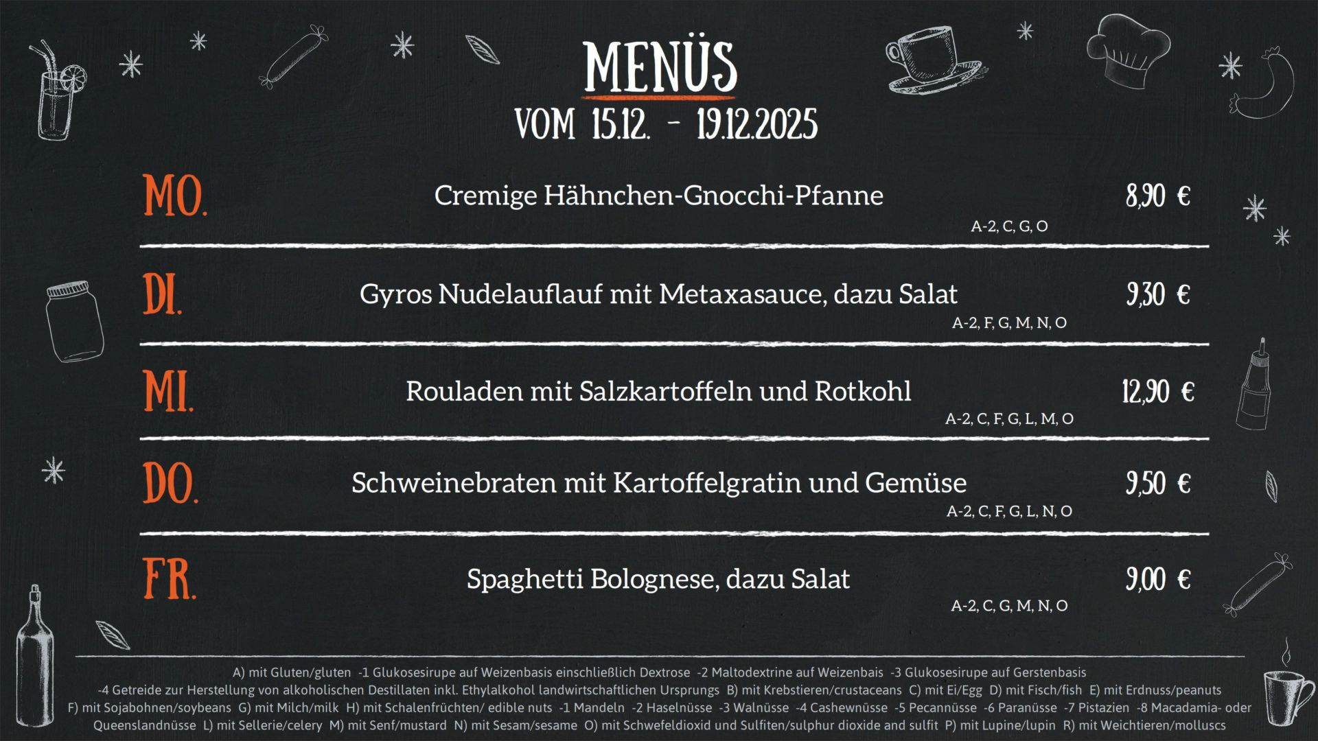 F) mit Sojabohnen/soybeans G) mit Milch/milk H) mit Schalenfrüchten/ edible nuts -1 Mandeln -2 Haselnüsse -3 Walnüsse -4 Cashewnüsse -5 Pecannüsse -6 Paranüsse -7 Pistazien -8 Macadamia- oder Queenslandnüsse L) mit Sellerie/celery M) mit Senf/mustard N) mit Sesam/sesame O) mit Schwefeldioxid und Sulfiten/sulphur dioxide and sulfit P) mit Lupine/lupin R) mit Weichtieren/molluscs